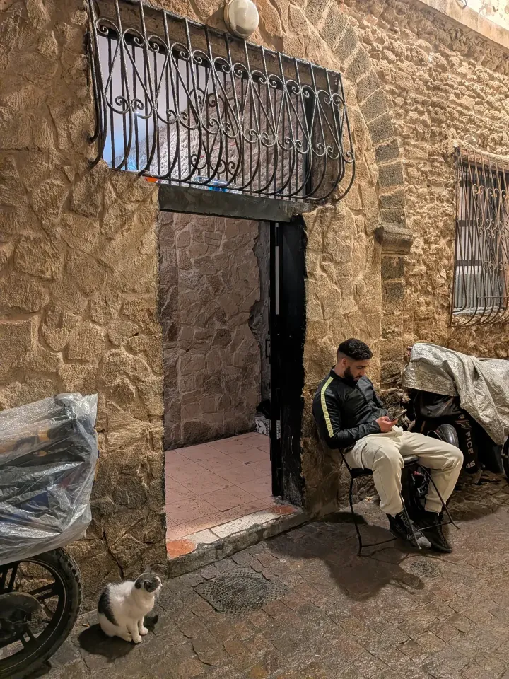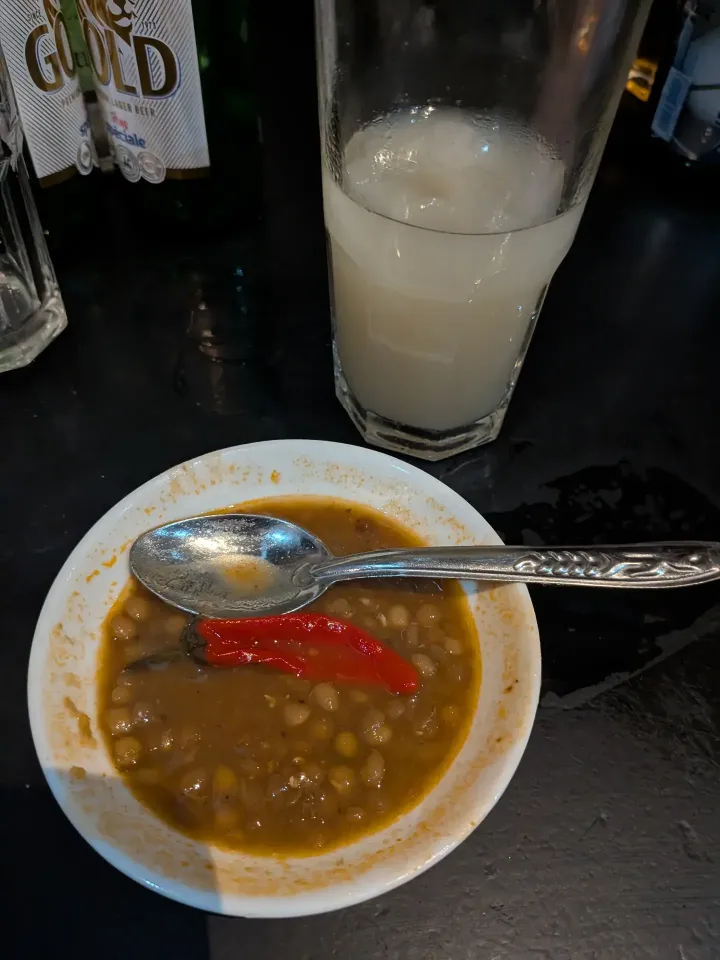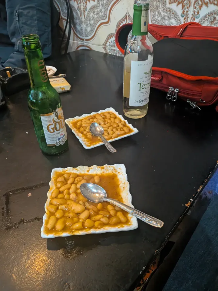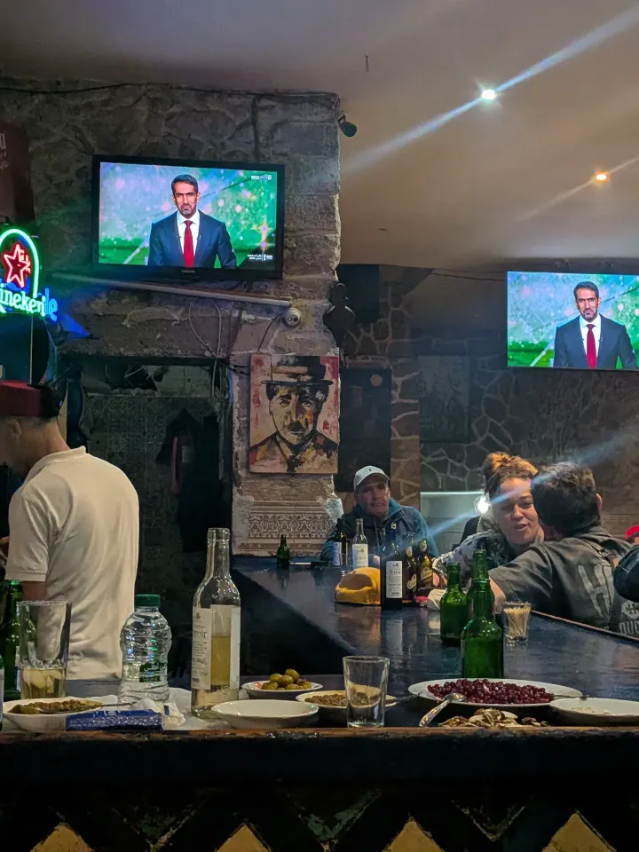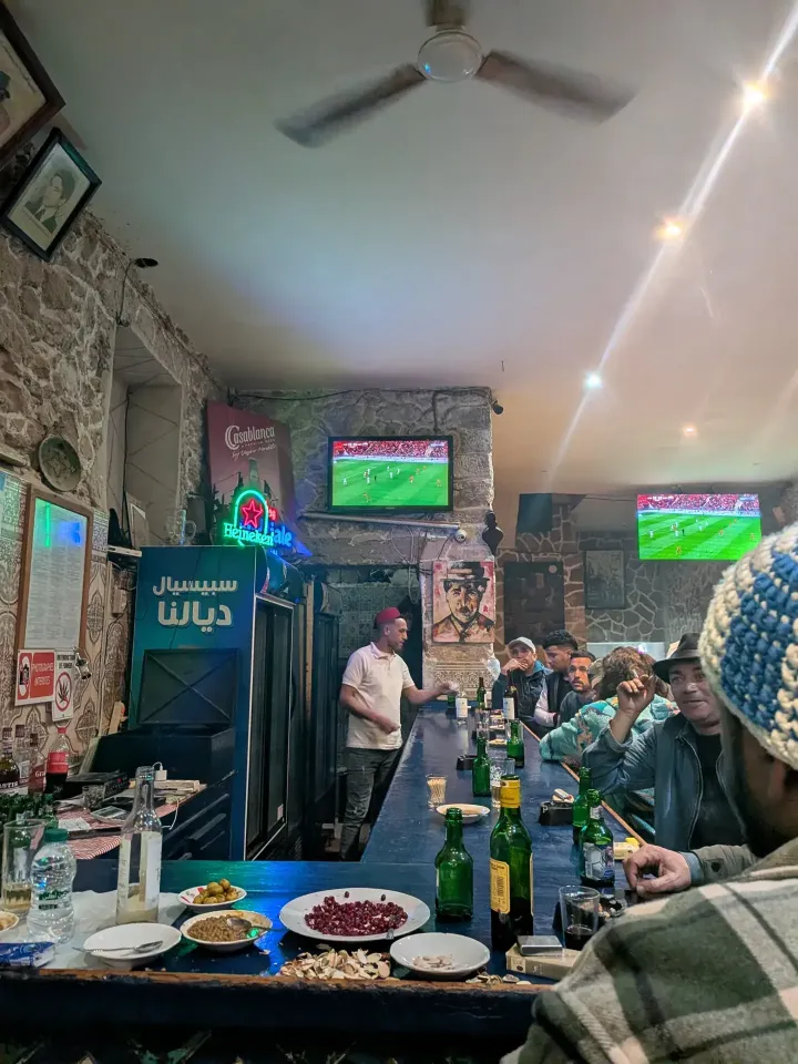Zu den Getränken werden in kleinen Porzellanschüsseln Snacks gereicht: Linsen, Bohnen, Kichererbsen. Auf mehreren Monitoren läuft Fußball. Das Auftaktspiel des Africa Cups 2025 Marokko gegen die Komoren. Ein in der ersten Halbzeit verschossener Elfmeter erzeugt Unruhe und Nervosität. Kurz nach der Pause dann das Tor für Marokko. Erleichterung. Ein herrlicher Fallrückzieher entscheidet das Spiel. Freudentränen auf der Wange des freundlichen Kellners.