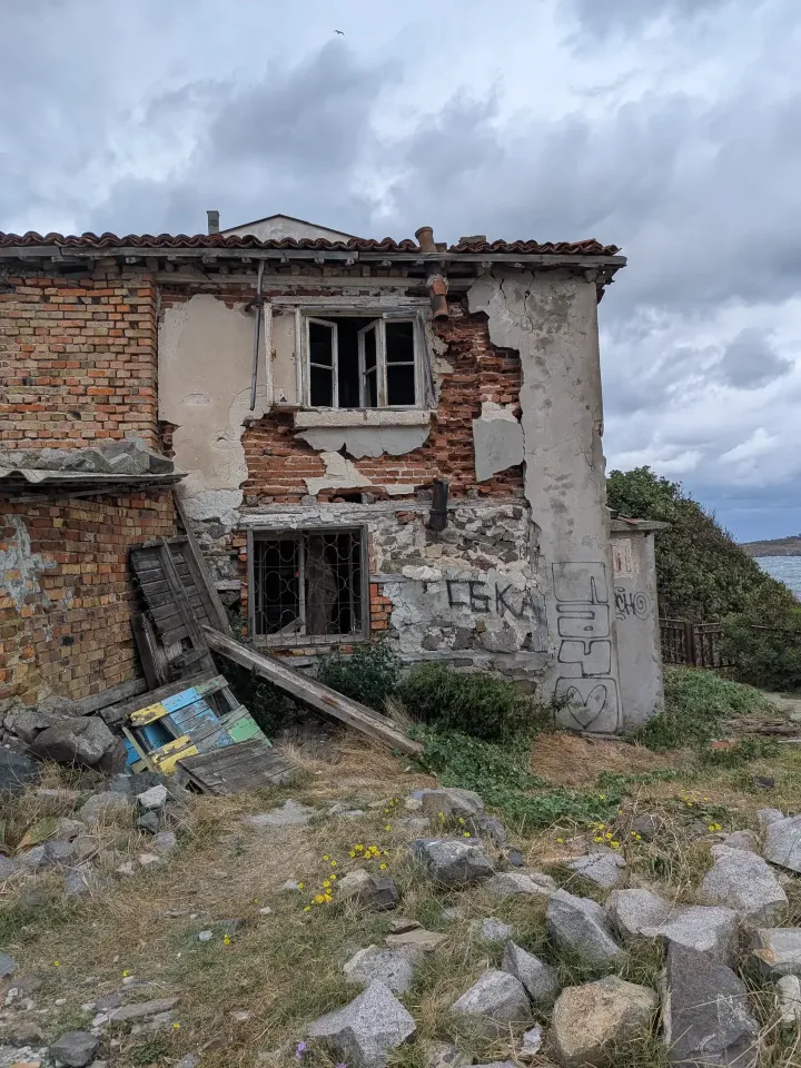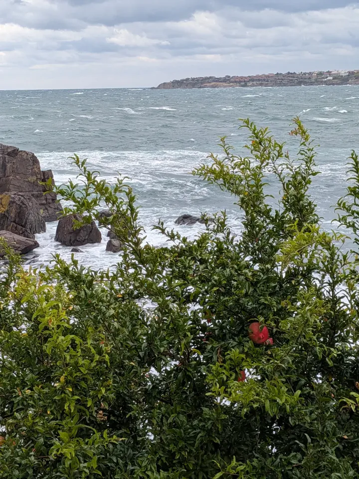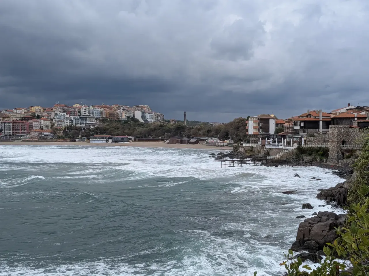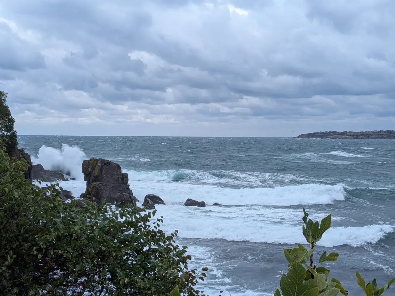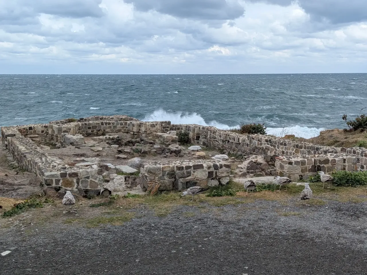 Jetzt wird es eine 45-minütige Busfahrt von Burgas entlang der Küste. Der Spätsommer hat sich nun endgültig verabschiedet. Auf der Hinfahrt regnet es wie aus Kübeln. Der Bus hält auf der schmalen Landbrücke, welche die Halbinsel mit dem Festland verbindet. Ein heftiger Sturm peitscht die Wellen in die Bucht.