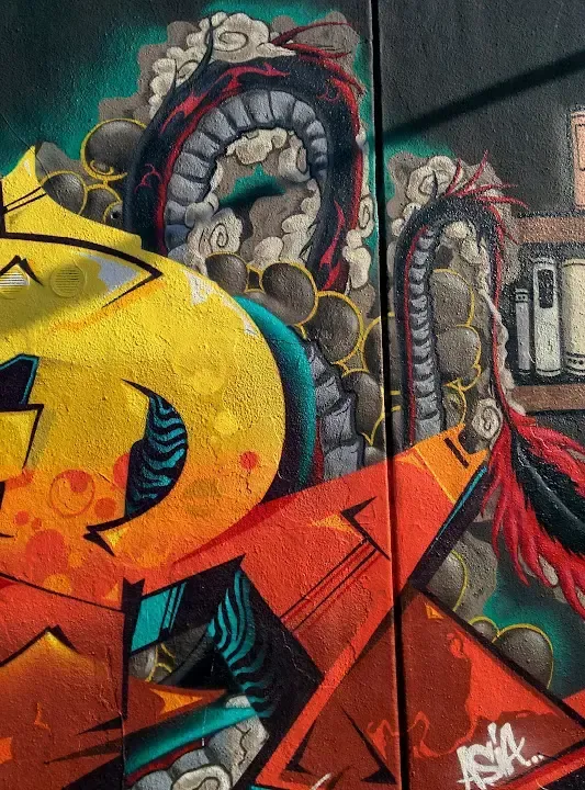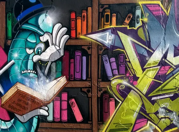 Ich lege mich dann mal fest: Das schönste Bild der Stadt gibt das der ehemaligen Zeche Wiendahlbank in Kruckel Nachdem ich vor gut einem Jahr schon einmal begeistert die dortigen Wandbilder festhalten durfte, stolperte ich gestern zufällig über die neu übermalte Wand. Gegenüber des dortigen Pennymarktes findet sich bezeichnenderweise an der Straße Bunte Bank ein etwa 50 Meter langes Bild mit Büchern, Drachen und ... Ach. Schaut sebst: