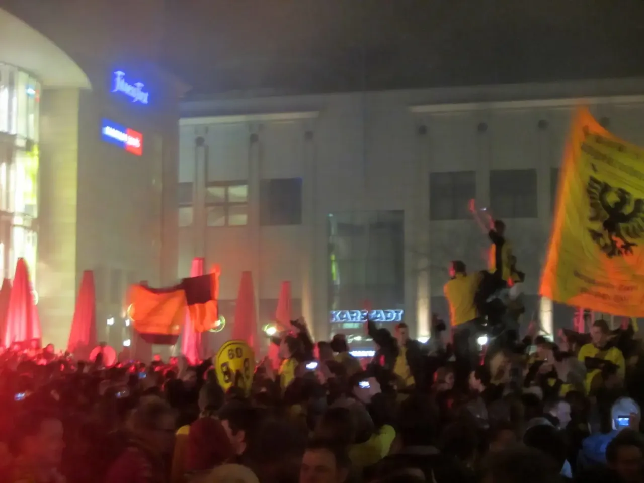 Oh wie ist das schön. Oh wie ist das schön. So was hat man lange nicht gesehen. So schön. So schön. Der amtierende deutsche Meister und Pokalsieger 2012 schwingt sich in der Westfalenhütte am Wahlsonntag auf den Korso-Truck und ein Lindwurm nicht enden wollender Freude zieht durch Dortmund. Über den Borsigplatz zum U. Menschen aller Hautfarben und Nationalitäten, jung und alt, betrunken und nüchtern: Gewinner des Doubles. Immer wieder deutscher Meister deutscher Meister BVB hallt es durch die Stadt.